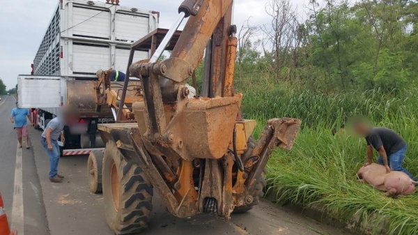 Um caminhão carregado com cerca de 200 porcos tombou no km 2 da BR-153, em Jacarezinho, no norte pioneiro do Paraná, na madrugada desta sexta-feira (10). O condutor, de 39 anos, sofreu ferimentos leves.