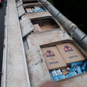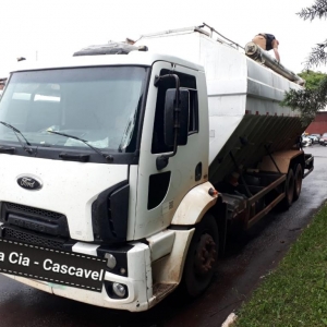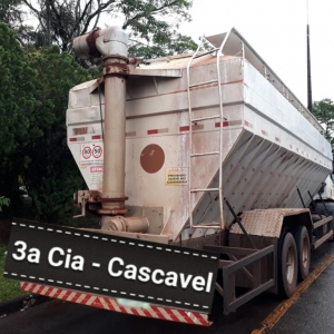 Após vistoria no veículo foi encontrado um carregamento de aproximadamente 350 caixas de cigarros de diversas marcas de origem estrangeira no interior do Silo, sendo identificado o Caminhão Ford / Cargo 3133, com placas de Toledo.
