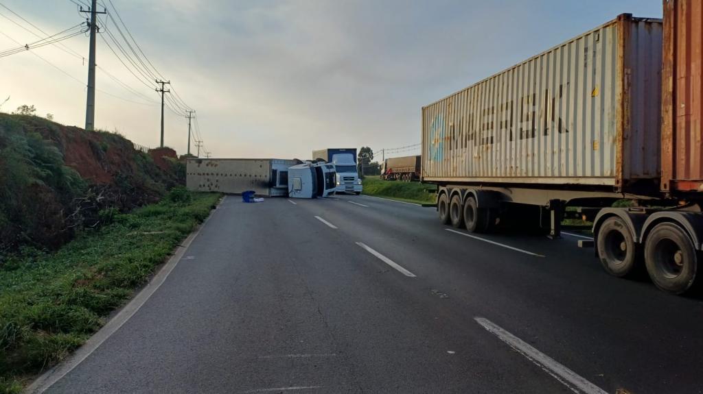 Durante o atendimento da ocorrência, o trânsito ficou parcialmente interditado para o transbordo da carga e a retirada do veículo. A situação foi registrada pelas autoridades competentes.