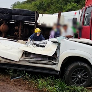 Um caminhão silo, carregado com ração, tombou em cima de um carro e matou uma mulher na BR 163, em Santa Lúcia, próximo de Capitão Leônidas Marques, no Oeste do Paraná.