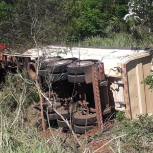 O caminhão trator Scania de Toledo, conduzido por um homem de 59 anos, acoplado a um semi-reboque Randon/SR/Corsa, tombou nesta terça-feira na PR-488 entre Diamante do Oeste e esquina Céu Azul.