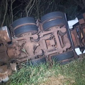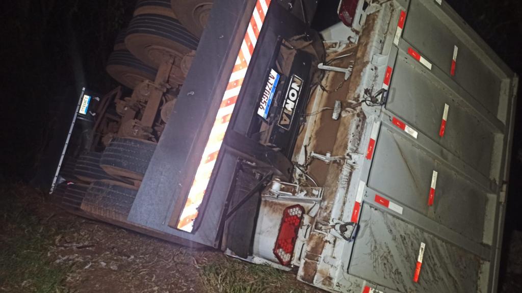O caminhão modelo Scania com placas Mercosul capotou na noite desta terça-feira na rodovia estadual PR 581 entre Toledo e Tupãssi.