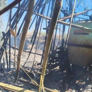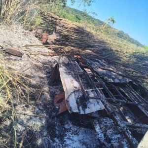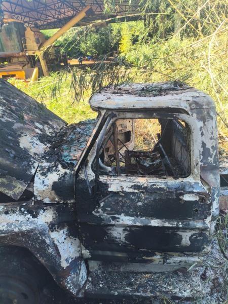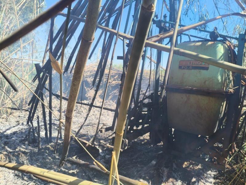 As chamas tomaram grandes proporções e destruíram por completo o veículo. O fogo também atingiu um bambuzal e um pulverizador agrícola, que também ficou parcialmente destruído.