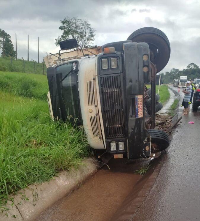 Um caminhão Mercedes Benz L-1513 de cor branca, registrado na cidade de Umuarama, conduzido por um homem de 56 anos, acabou tombando na rodovia, a poucos metros da rotatória que dá acesso a BR-163 e a Av. Rio Grande do Sul.