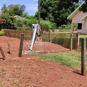 No início da tarde de hoje, quinta-feira um caminhão carregado com um maquinário agrícola rompeu fios de energia e quebrou um posto na entrada do distrito de Novo Sarandi, em Toledo.