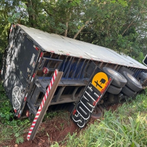 Na tarde de hoje (29), um caminhão baú com placas de Pérola, região de Umuarama, saiu da pista e caiu às margens da rodovia PR-491, em Nova Santa Rosa, nas proximidades da ponte do Rio Sanga Xerê, no trecho com sentido a Maripá. O veículo transportava farinha, carregada em Marechal Cândido Rondon, com destino final ao estado de São Paulo.