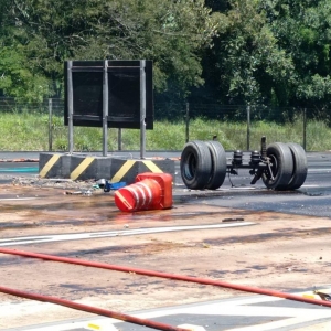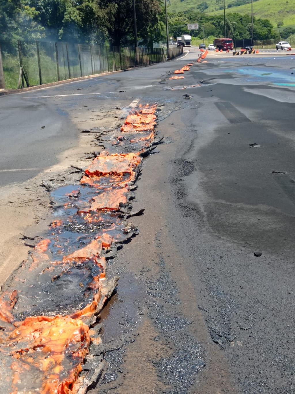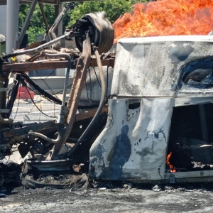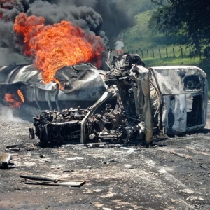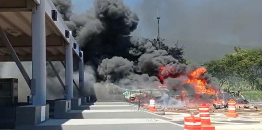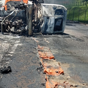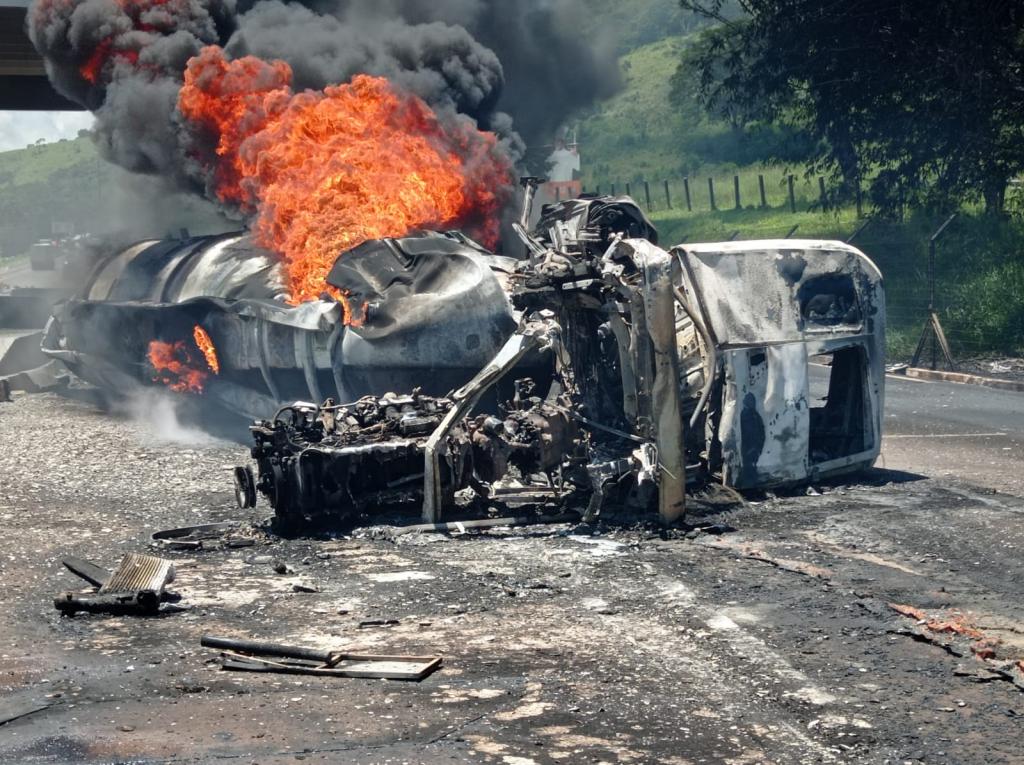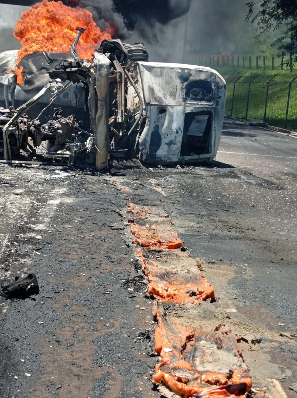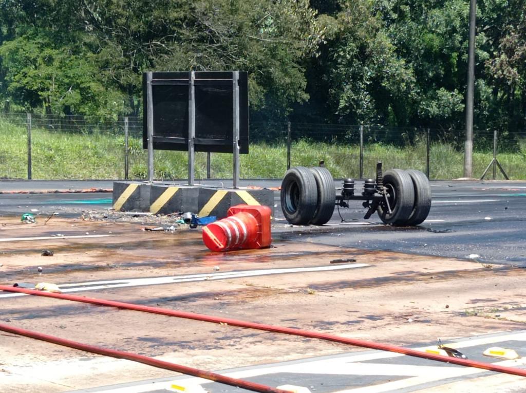 De acordo coma Polícia Rodoviária Federal o caminhão colidiu contra a mureta da praça de pedágio e pegou fogo. O motorista ficou encarcerado e não foi possível retirá-lo.