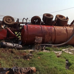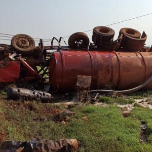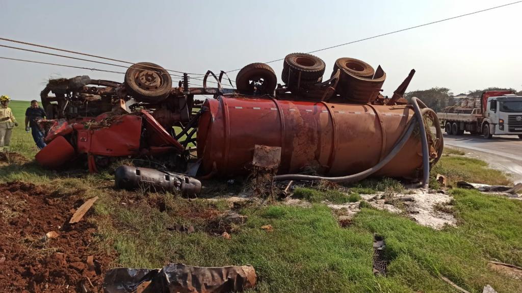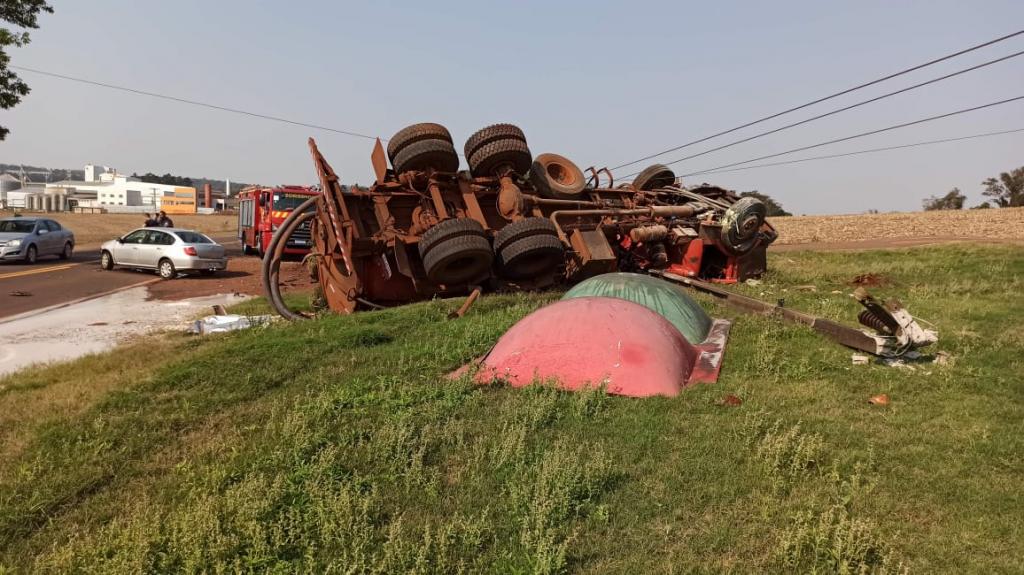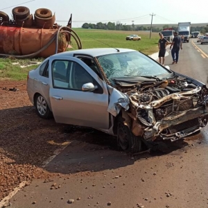 O caminhão Mercedes Benz, tanque, conduzido por um homem de 59 anos estava carregado com soro de leite que ficou esparramados no acostamento e o veículo Renault Symbol com a frente destruída.