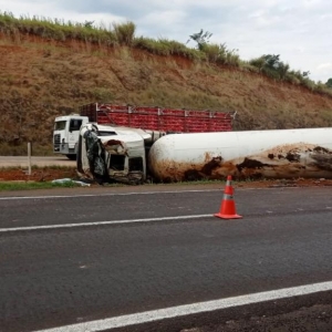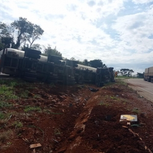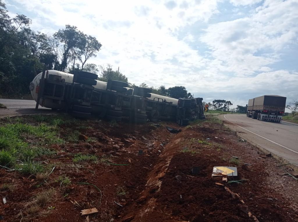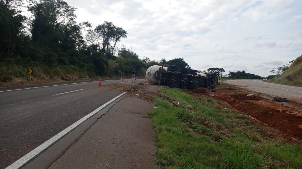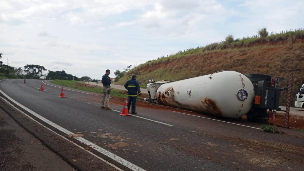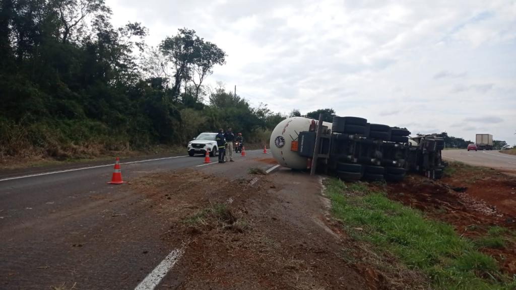Um caminhão que tracionava uma carreta tanque carregada com Gás Liquefeito de Petróleo (GLP), conhecido como gás de cozinha, tombou no início da tarde desta segunda-feira (17), no km 161 da BR-163, no município de Lindoeste.