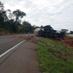 Conforme a Polícia Rodoviária Federal, ocorreu vazamento da carga, sendo necessária interdição total da via no sentido Capitão Leônidas Marques por cerca de 1h45.