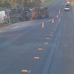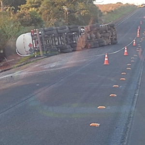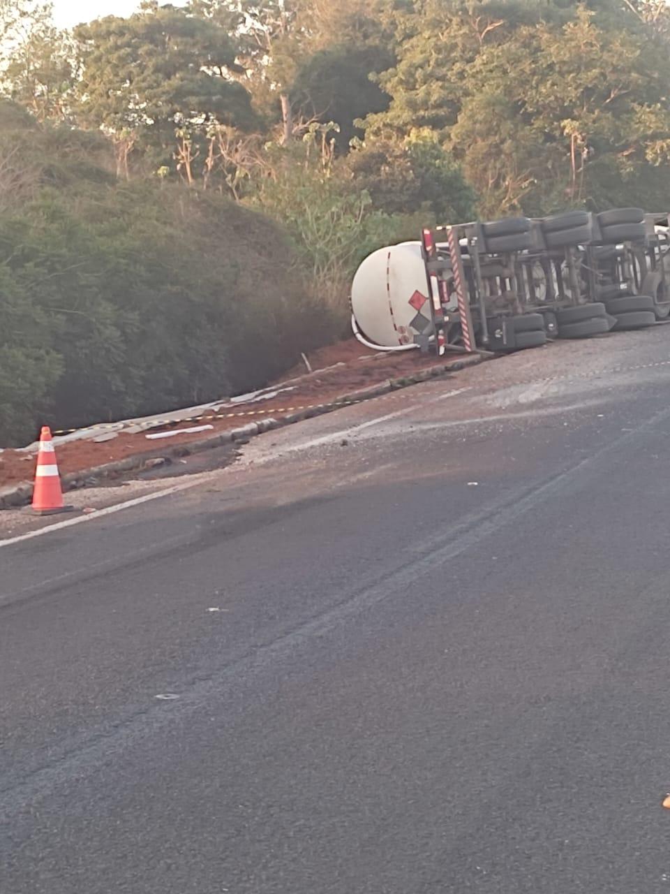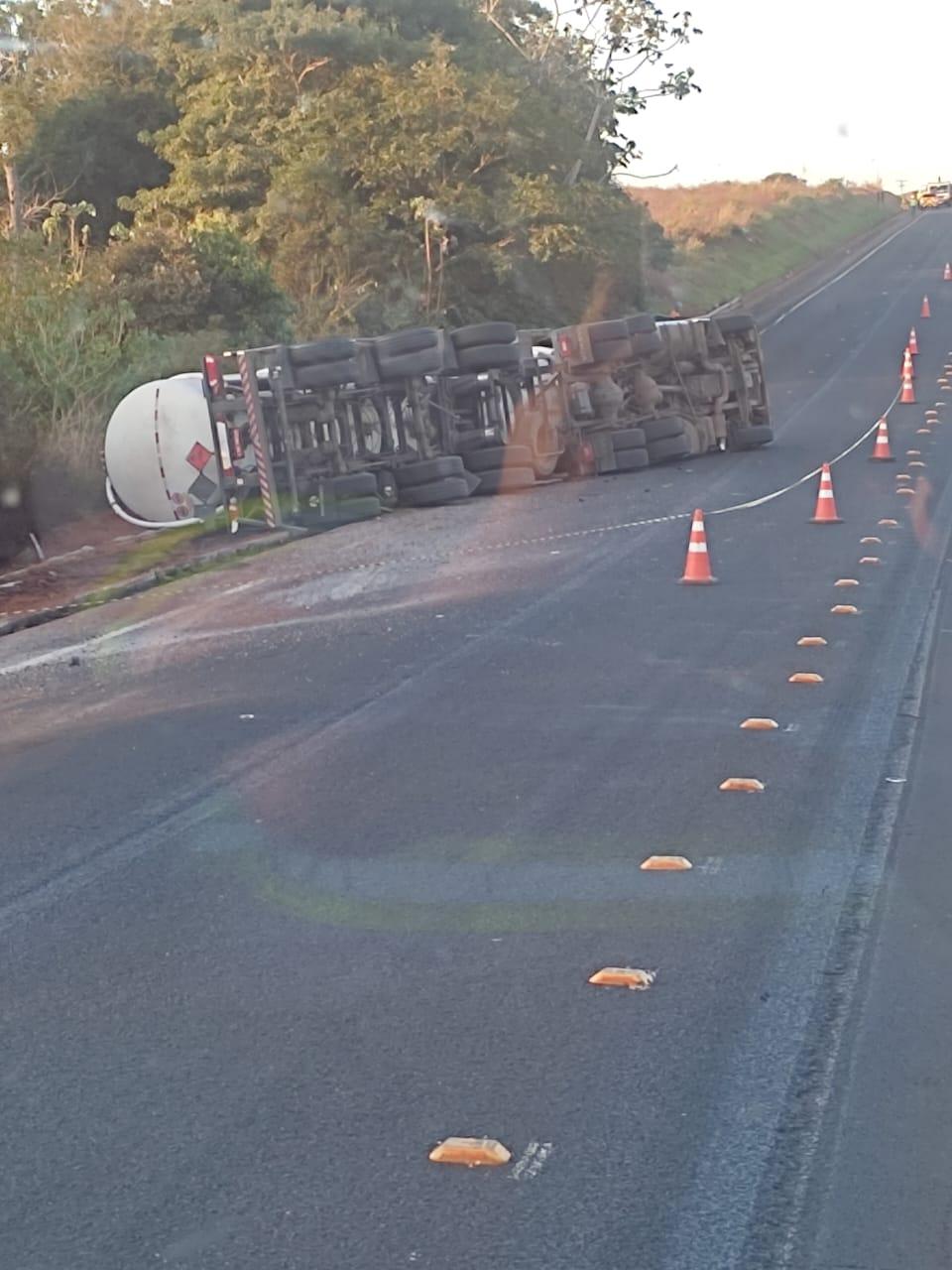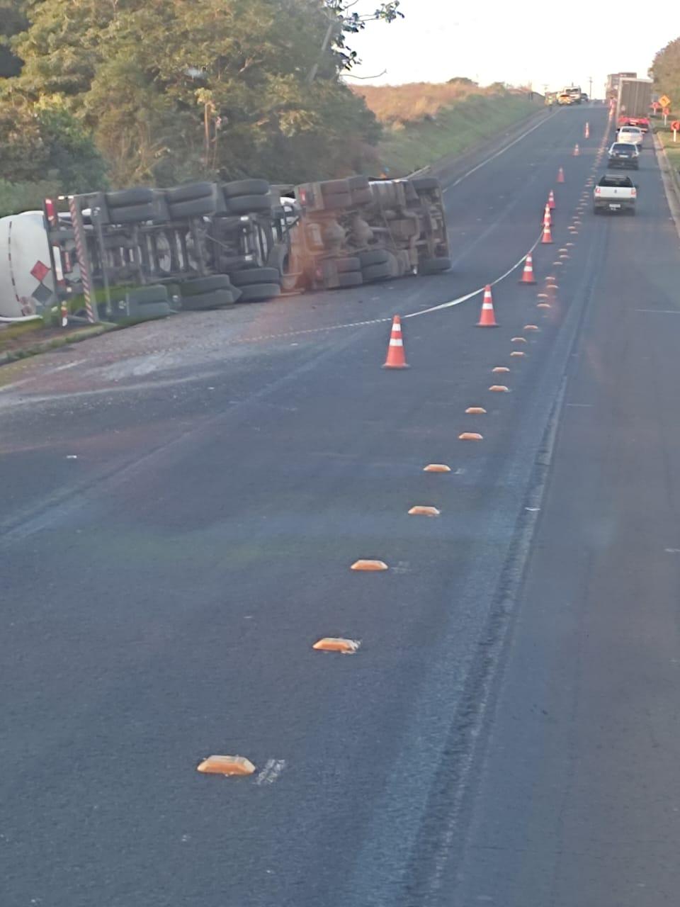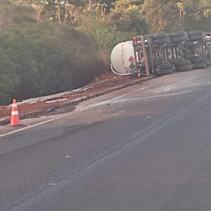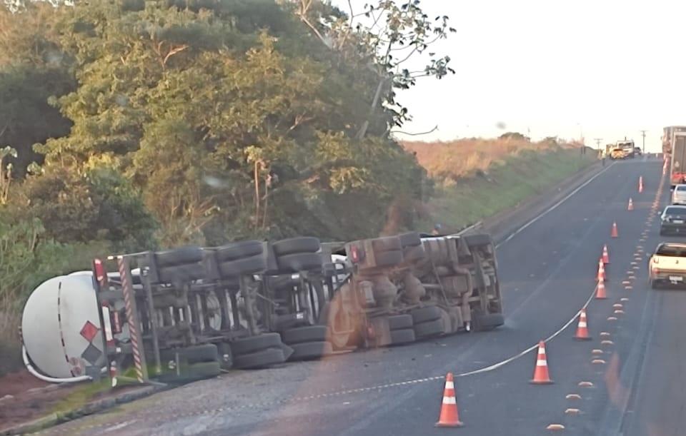 De acordo com as informações, a carreta seguia sentido Mato Grosso do Sul quando acabou tombando logo após a ponte. O veículo, do tipo tanque, transportava carga perigosa — sinalizada com o diamante de risco da ONU/NBR, utilizado para indicar substâncias inflamáveis ou químicas. Com o tombamento, parte do material se espalhou ao lado da pista.