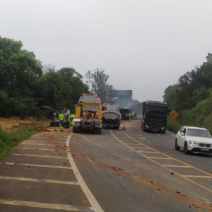 O caminhão estava carregado de soja, que se espalhou na pista. Equipes da PRF e do Departamento de Estradas de Rodagem (DER) estão no local trabalhando na limpeza e controle do trânsito.