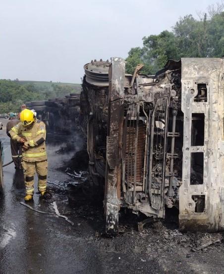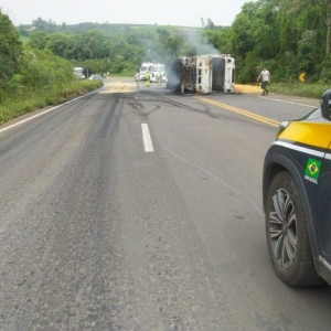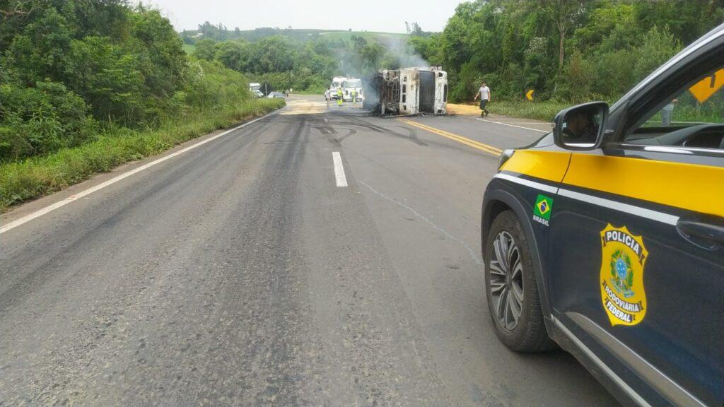 De acordo com informações da Polícia Rodoviária Federal (PRF), o caminhão tombou e uma caminhonete atingiu o tanque de combustível dele, que incendiou.