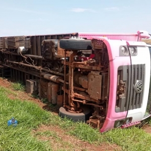 Um caminhão tombou no canteiro central na parte da manhã destal quinta-feira na rodovia BR467 entre Toledo e Cascavel a 500 m após o distrito Sede Alvorada.