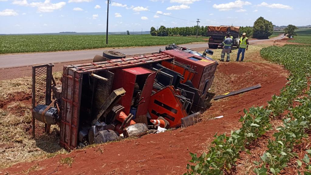 Um caminhão tombou no final da manhã desta quinta-feira na rodovia PR-239 próximo ao distrito de Bragantina no município de Toledo e envolveu um caminhão Ford com placas do município de Guarapuava com homens que trabalham na manutenção de rodovias.