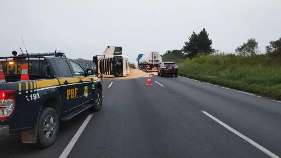 Segundo a PRF (Polícia Rodoviária Federal), o veículo seguia sentido a Curitiba, quando atravessou a rodovia e tombou sentido norte (Curitiba a Ponta Grossa). A carga do veículo ficou espalhada sobre a pista.