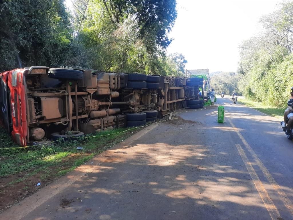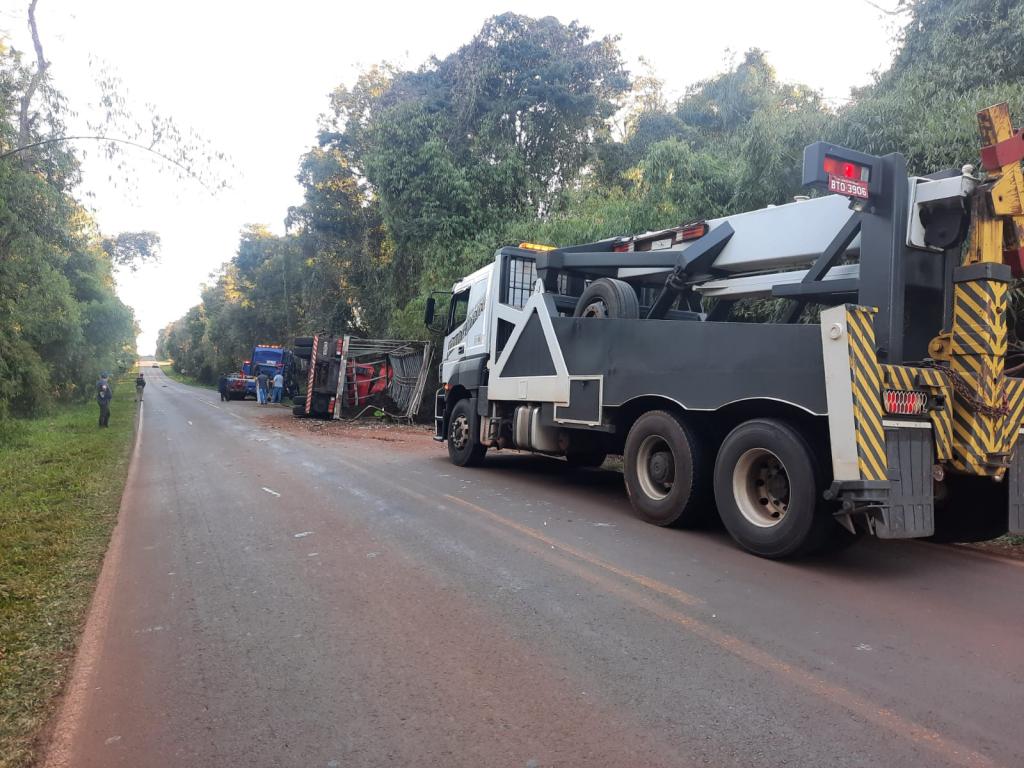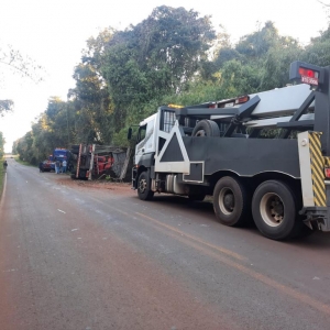 Um caminhão Mercedes-Benz Axor, acoplado a um semirreboque, tombou no sábado (16) na rodovia PR-473, em Quedas do Iguaçu. O acidente aconteceu na altura do km 53, no trecho que liga o município à PR-475.