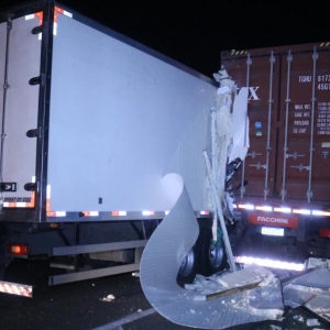 A colisão traseira, na região dos Pinheirinhos, envolveu um caminhão contêiner, carregado com tintas, e um baú refrigerado, com carga de carnes e frios, que seriam descarregados em um hipermercado do Município.