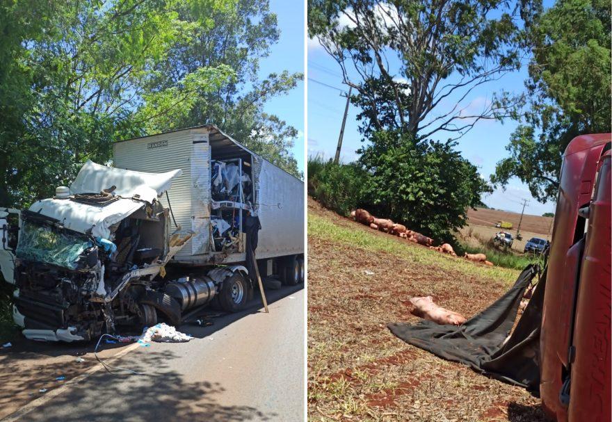 O segundo caminhão, que seguia no sentido oposto, transportava suínos vivos, e contabilizou uma vítima leve no acidente.