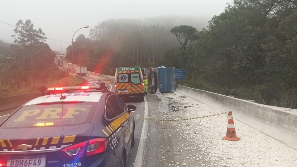 Segundo a Polícia Rodoviária Federal (PRF), o caminhão tombou, o motorista foi ejetado do veículo e ficou preso embaixo da carroceria.