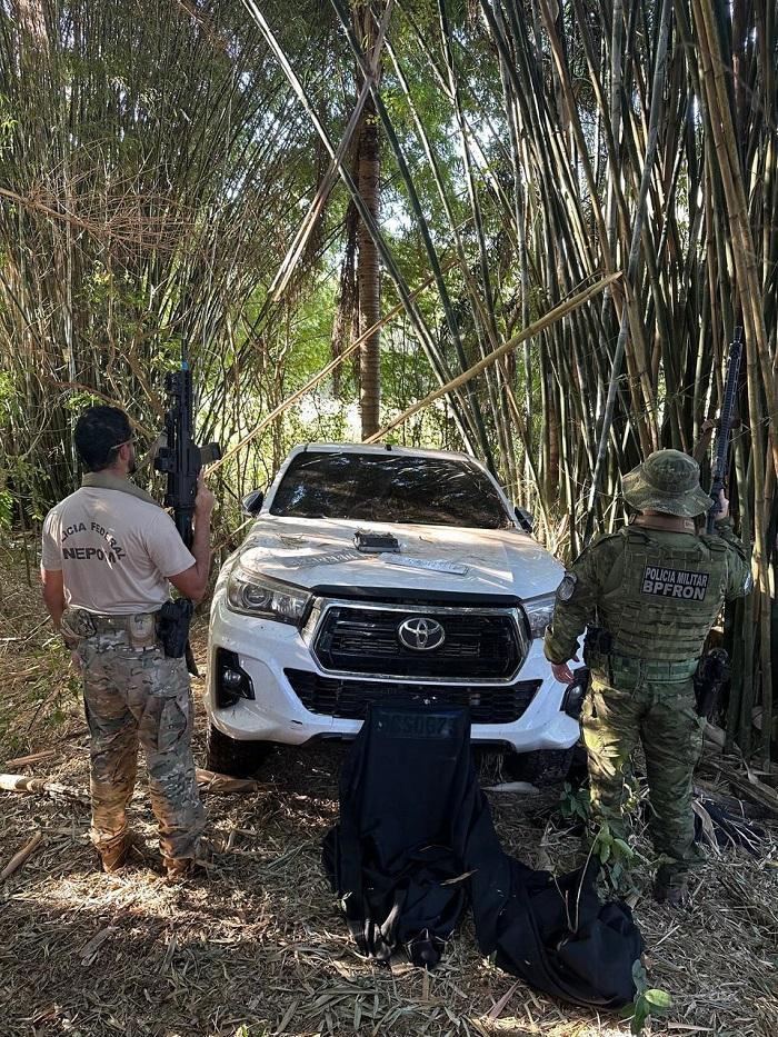 Uma caminhonete Toyota Hilux furtada foi recuperada nesta segunda-feira (14), na zona rural de Guaíra, no Oeste do Paraná, durante uma ação conjunta da Polícia Militar do Paraná, por meio do BPFron (Batalhão de Polícia de Fronteira), e da Polícia Federal, com apoio do NEPOM (Núcleo Especial de Polícia Marítima).