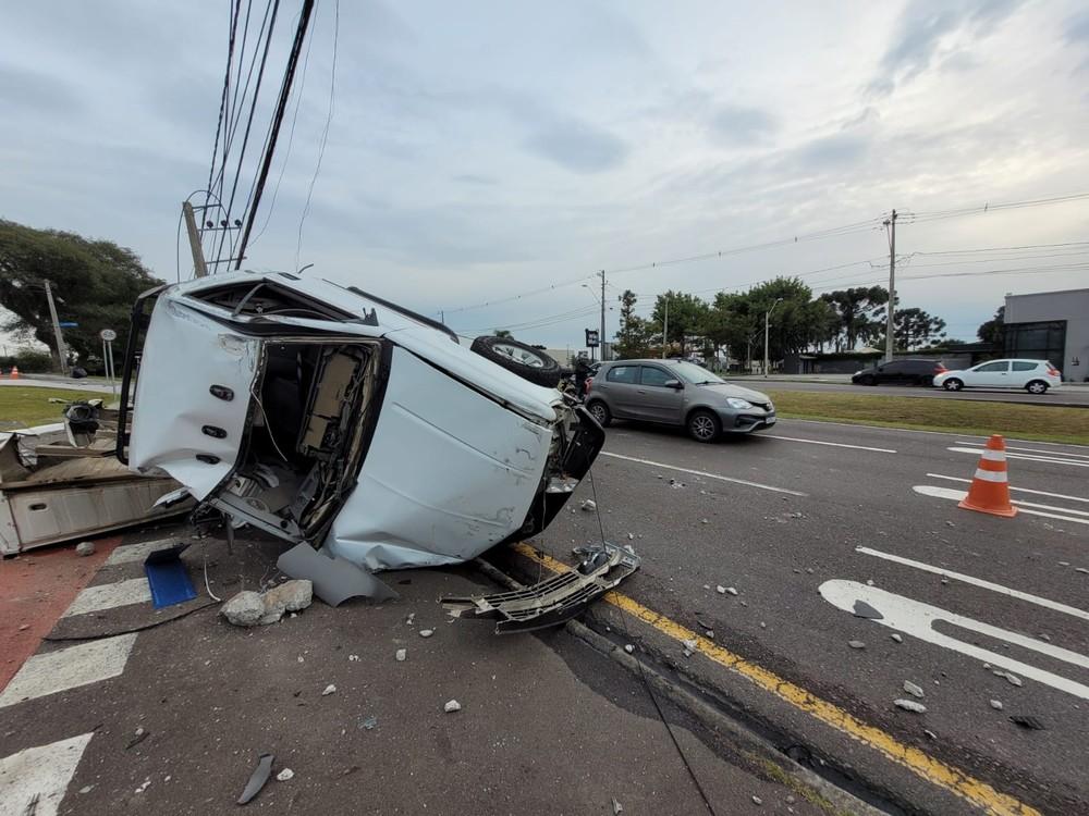 Uma caminhonete partiu ao meio após bater em dois postes na madrugada desta quinta-feira (24) no bairro Uberaba, em Curitiba. Por conta do acidente, parte do bairro ficou sem energia elétrica.