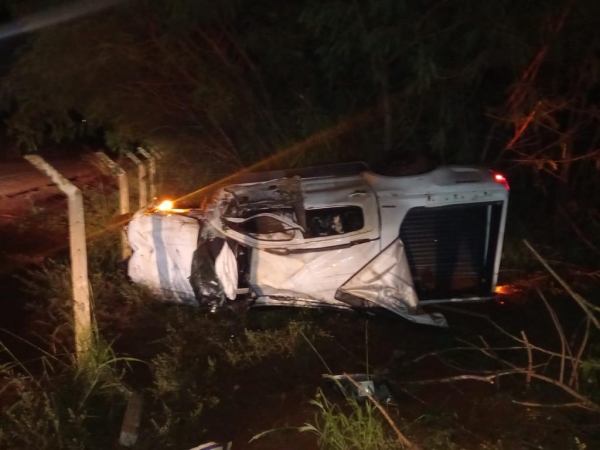 Na sequencia, a camionete ficou desgovernada e capotou por cerca de 70 metros, arrebentando uma cerca com pilares de concreto e parado em uma área de mato.