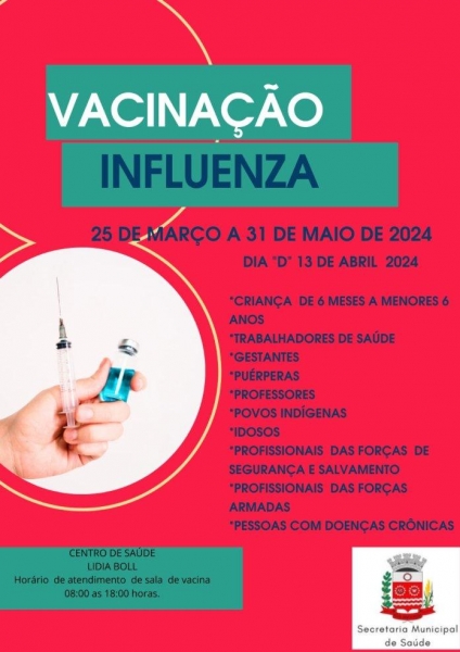 A Prefeitura de Nova Santa Rosa por meio da Secretaria de Saúde informa o início da campanha de vacina contra a Influenza (gripe). A partir do dia 25 de março a 31 de maio com o dia D no dia 13 de abril de 2024. Liberada para os grupos prioritários. A Sala de Vacina do Centro de Saúde Lídia Boll atende das 8h às 18h sem fechar ao meio-dia. Importante que todos tenham o cartão de vacina e cartão sus.