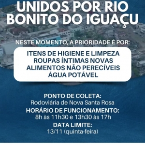 As doações podem ser entregues na Rodoviária de Nova Santa Rosa, que funciona das 8h às 11h30 e das 13h30 às 17h. A campanha segue até o dia 13 de novembro (quinta-feira).