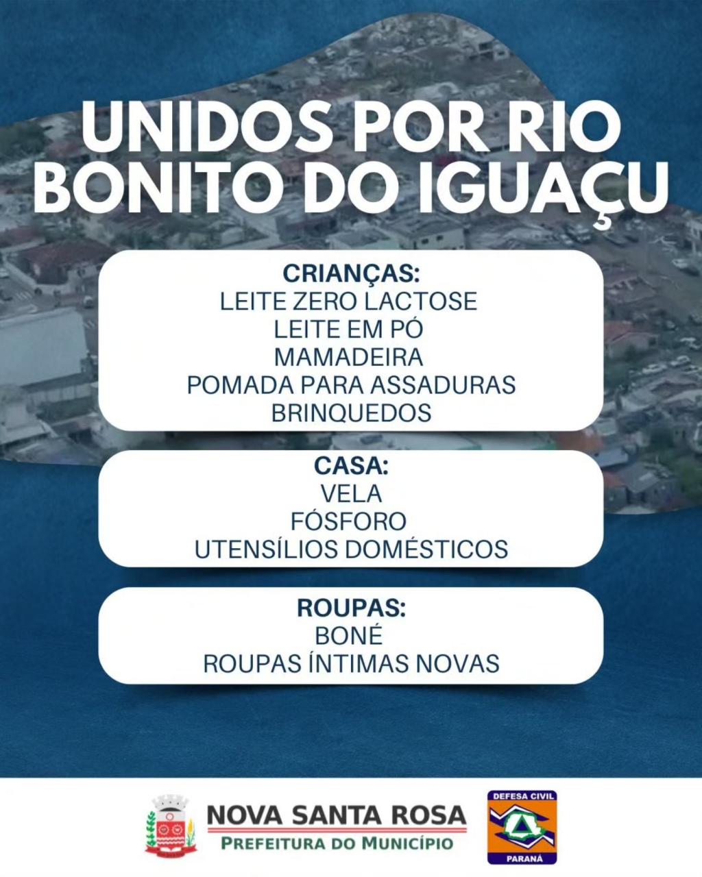 A Prefeitura de Nova Santa Rosa, juntamente com a Defesa Civil, informa que está em andamento uma campanha solidária em apoio às famílias de Rio Bonito do Iguaçu, que enfrentam dificuldades após a passagem do tornado que atingiu o município. A mobilização busca reunir doações prioritárias de itens de higiene e limpeza, roupas íntimas novas, alimentos não perecíveis e água potável.