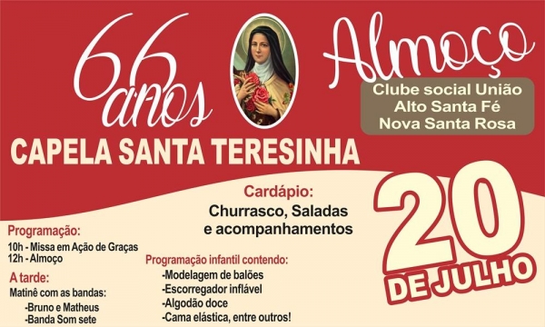 A comunidade de Alto Santa Fé, distrito de Nova Santa Rosa, se prepara para celebrar os 66 anos da Capela Santa Teresinha com uma grande festa no domingo, dia 20 de julho. O evento será realizado no Clube Social União e promete reunir famílias da região para um dia repleto de alegria.