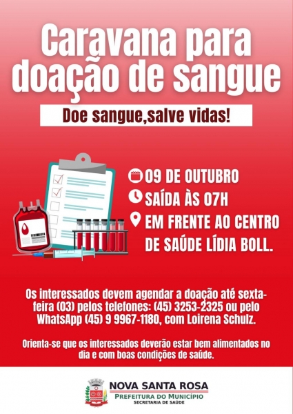 A Prefeitura de Nova Santa Rosa, por meio da Secretaria de Saúde, em parceria com o Grupo de Doadores de Sangue Missão Salva-Vidas, informa que haverá caravana para doação de sangue na próxima quinta-feira (09), na Unidade de Coleta de Sangue Haroldo Alberto Güttges, instalada no Centro Integrado de Saúde (CIS), em Marechal Cândido Rondon. A saída está programada para as 7h, em frente ao Centro de Saúde Lídia Boll.