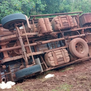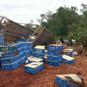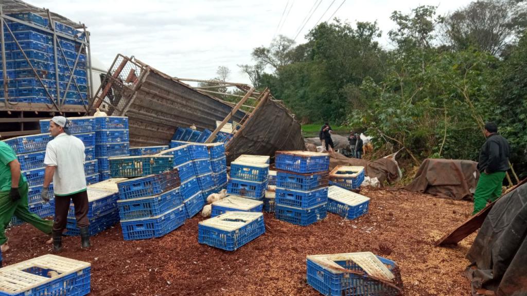 Trabalhadores estão realizando neste momento a transferência de uma carga de 4 mil frangos oriunda de Toledo com destino a Naviraí no Mato Grosso do Sul. O caminhão que transportava a carga tombou na noite desta quarta-feira (28).