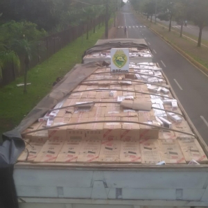 Foi empregado o Pelotão de Operações com Cães do BPFron na ocorrência que, após realizar revista no caminhão, foi constatado que os dois semirreboques acoplados ao caminhão estavam completamente carregados com cigarros contrabandeados do Paraguai, no total com cerca de 650 mil carteiras de cigarros, que, vendidas no mercado paralelo, a carga teria um valor final aproximado em um milhão e trezentos mil reais.
