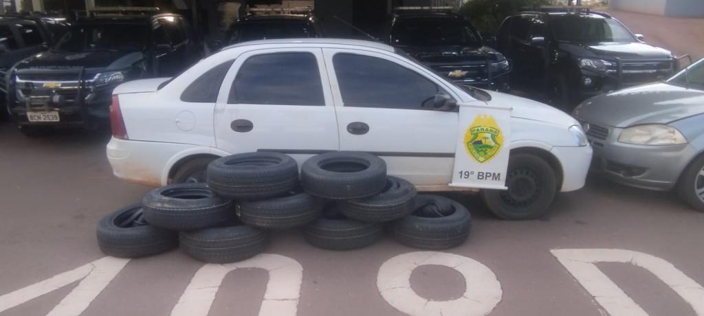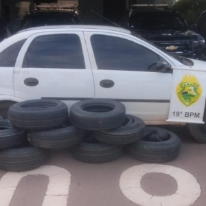 Enquanto a equipe ainda atendia essa ocorrência, que provocou lentidão no trânsito da rodovia, os policiais perceberam outro veículo em situação suspeita. Tratava-se de um Chevrolet Corsa, com placas paraguaias CAD-681, que transportava uma grande quantidade de pneus.