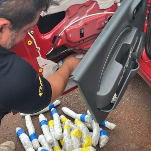 O veículo foi vistoriado e localizado vários tabletes com Skunk. O ocupante foi indagado sobre os pacotes, momento em que informou que sabia da existência da droga no carro, mas não sabia precisar exatamente do que se tratava.