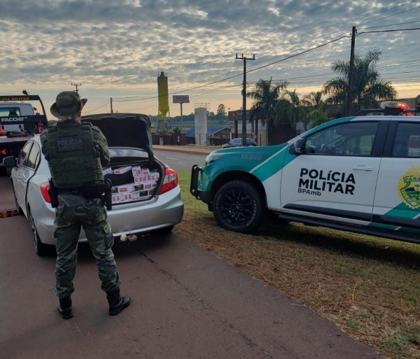 No interior do veículo um, Honda/Civic de cor prata, foram localizadas aproximadamente 25 caixas cigarro de origem estrangeira e um celular.