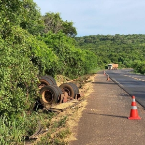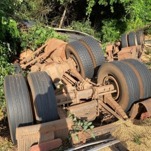 Carreta capota em curva perigosa da BR-163 entre Mercedes e Guaíra