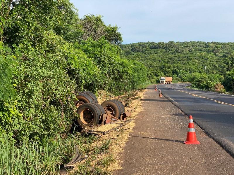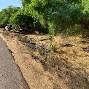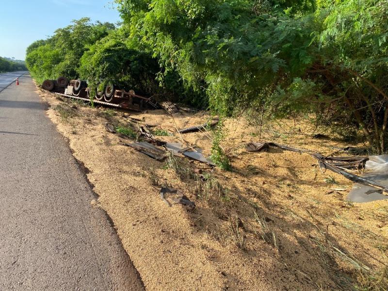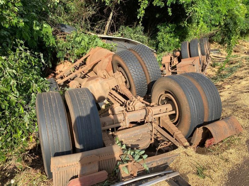 A carga de soja ficou espalhada e a carreta bastante danificada. Não há informações de feridos.