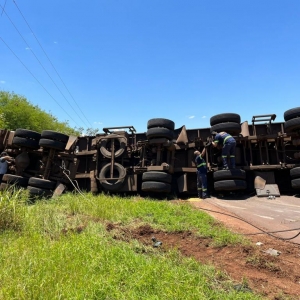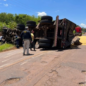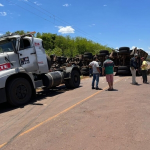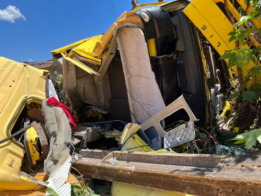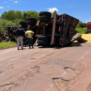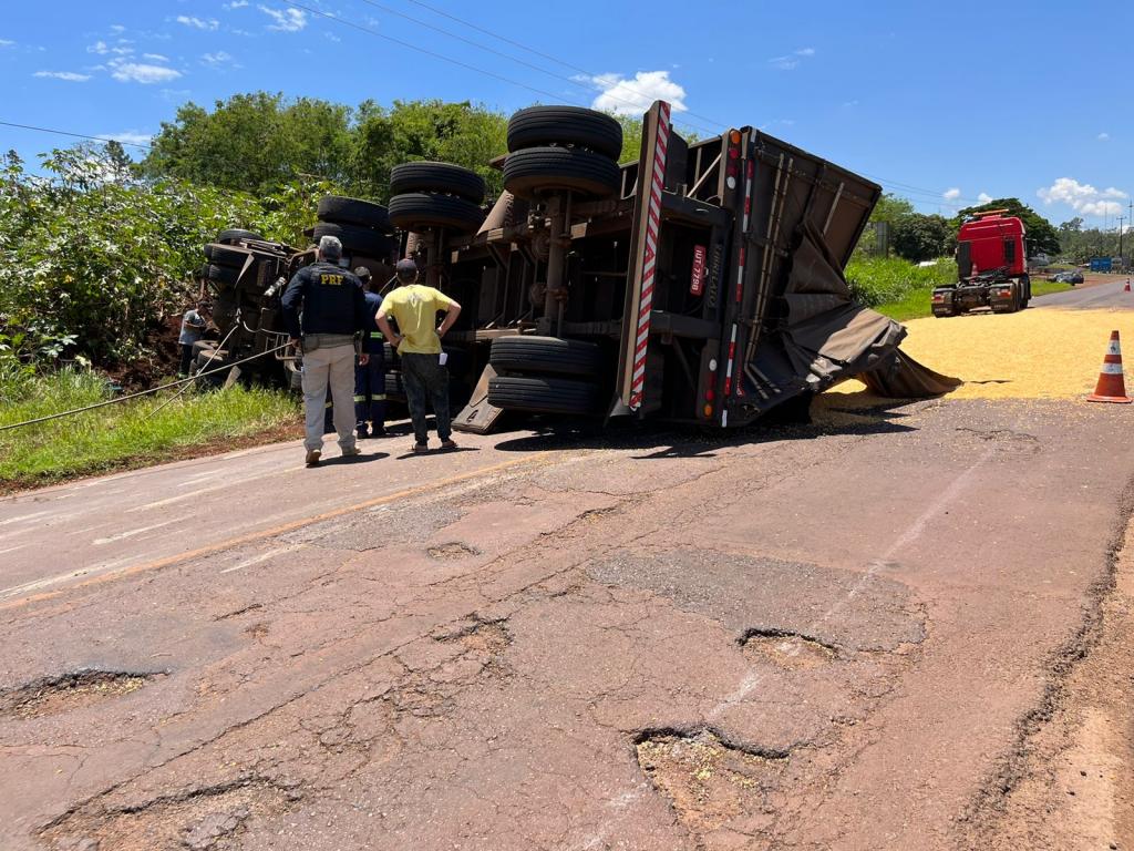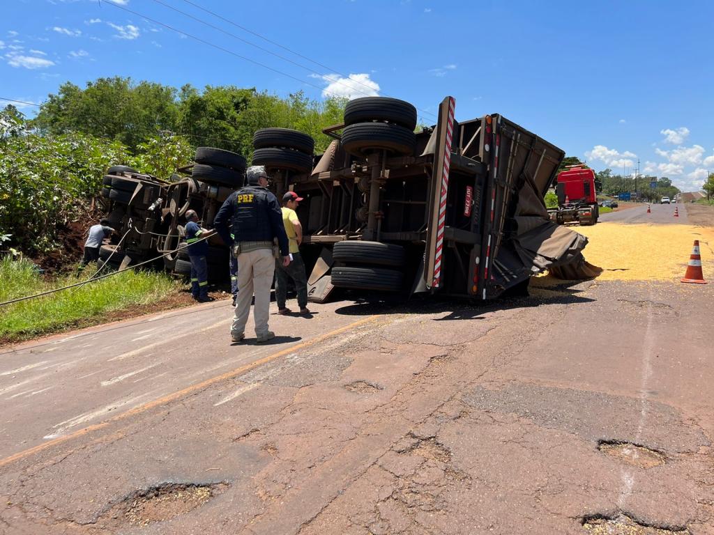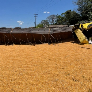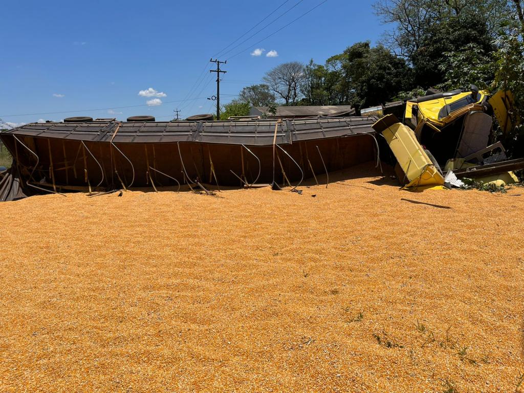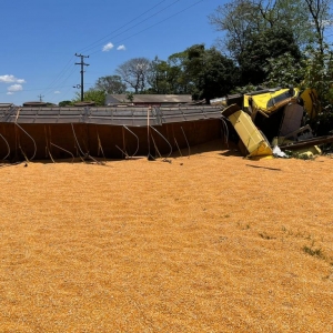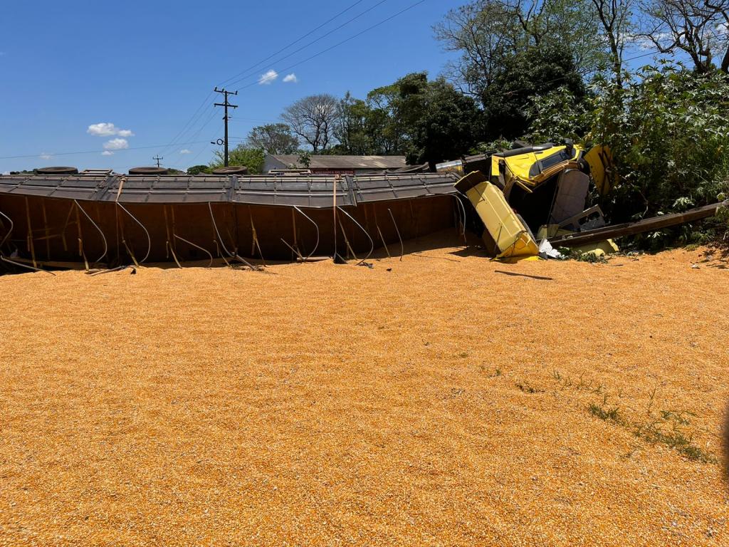 Após a colisão frontal com o Gol placa Mercosul, a carreta que seguia sentido Marechal Rondon para Toledo, tombou e o cavalo da carreta bateu violentamente contra um poste de energia metros à frente. A carga de milho ficou derramada sobre a pista da rodovia.