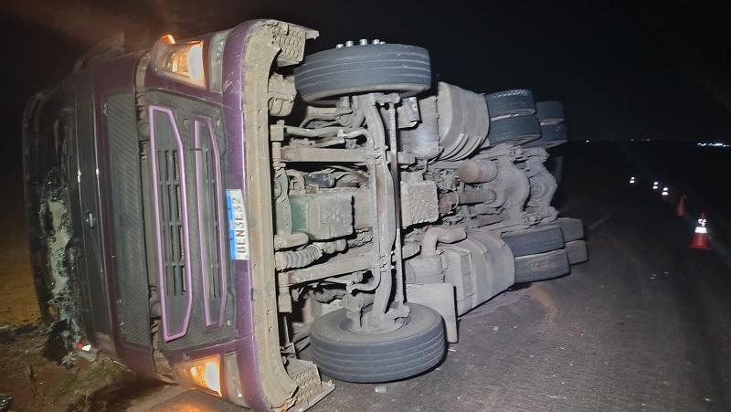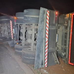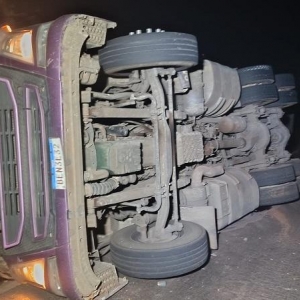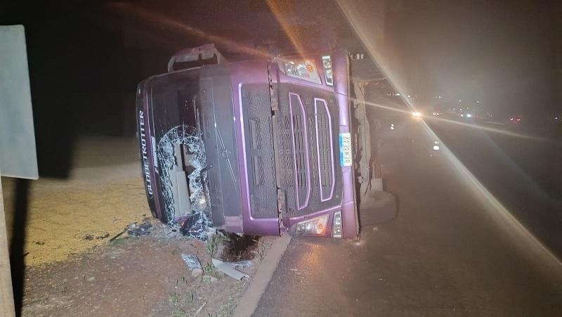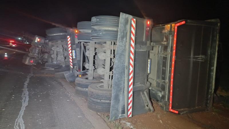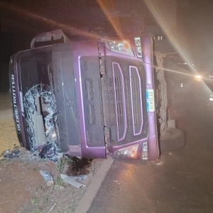 Na noite desta sexta-feira (29), uma carreta Volvo bitrem tombou na BR-163, no trecho entre a ponte sobre o Rio Lopeí e o distrito de Sede Alvorada, em Toledo. O veículo seguia em direção a Cascavel quando, de acordo com informações levantadas no local, as rodas do lado direito saíram da pista, provocando o tombamento.