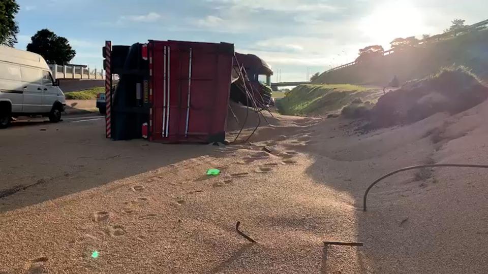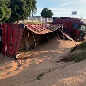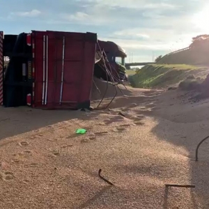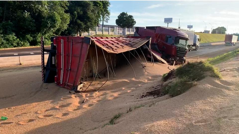 Uma carreta carregada com 50 toneladas de soja tombou e interditou parte da PRc 467 em Cascavel, no Oeste do Paraná. O acidente aconteceu na manhã de sábado (13), próximo ao viaduto da rua Jacarezinho no bairro São Cristóvão.