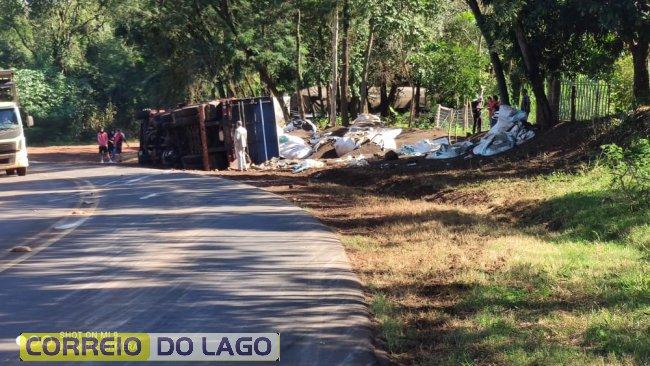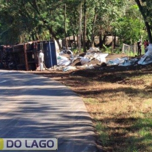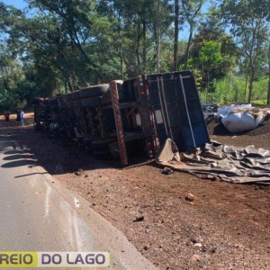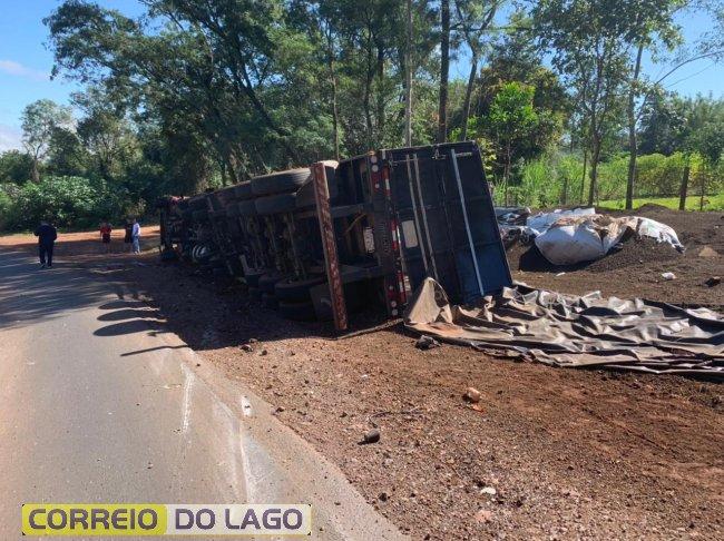Por volta do meio dia e meia desta quarta-feira (08), uma carreta carregada com bags de adubo, tombou em uma curva na PR 488, próximo à Ponte Queimada, na divisa entre as cidades de Diamante D’Oeste e Santa Helena.