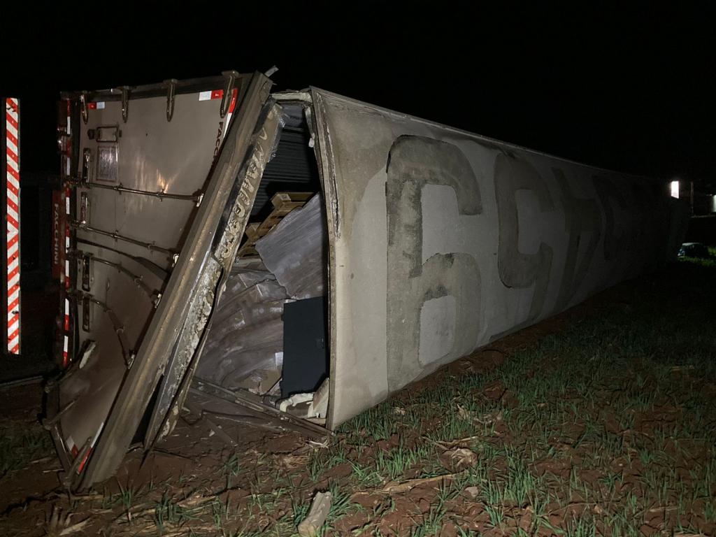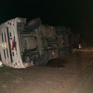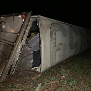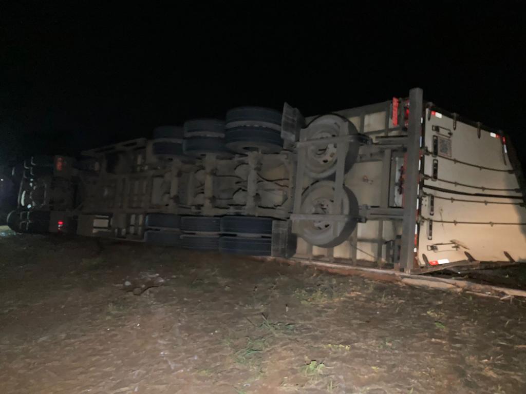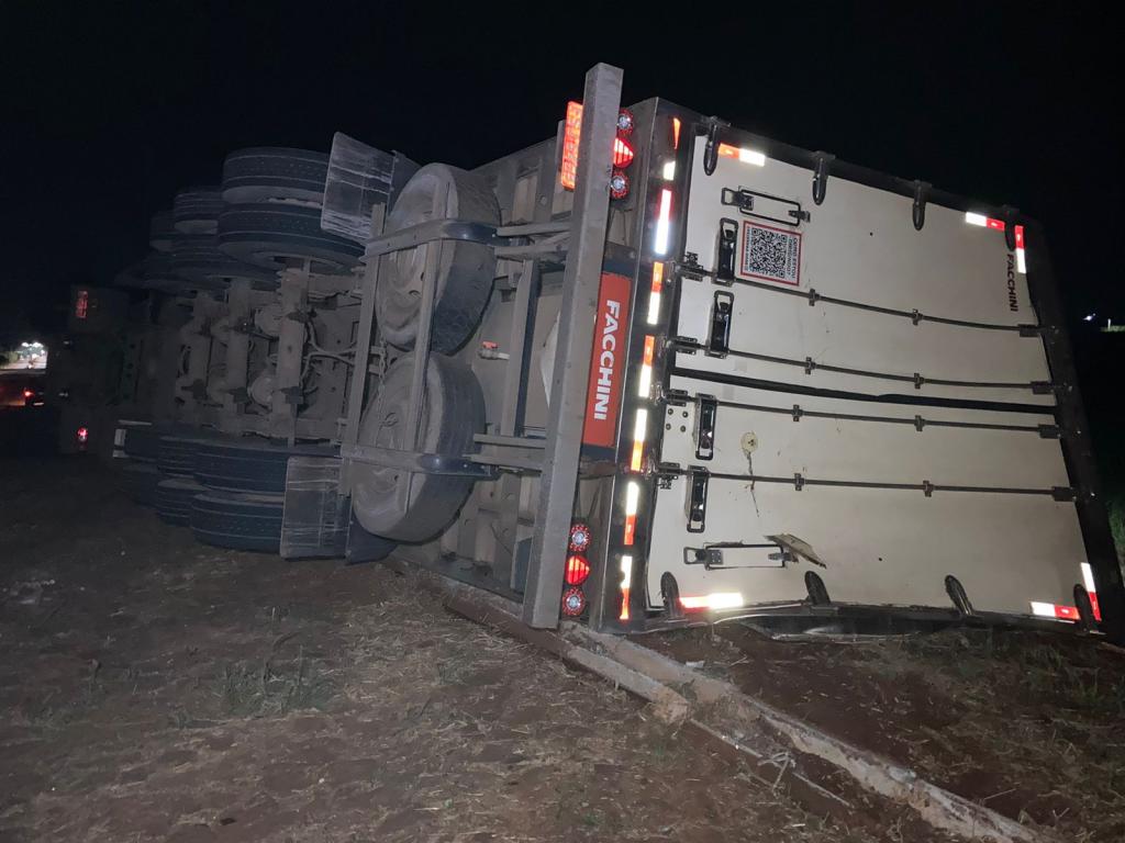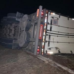 Uma carreta baú Mercedes Benz, carregada de frangos, e com placas de Campinas, São Paulo, tombou na noite desta terça-feira (21), na curva que da acesso a cidade de Nova Santa Rosa.
