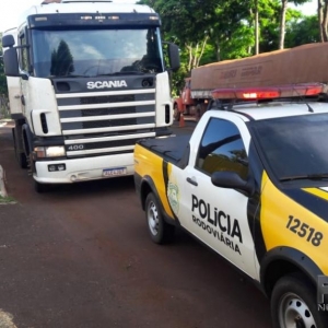 Por volta das 17h00 de hoje, durante patrulhamento na rodovia estadual PR 488, zona rural do município de Diamante do Oeste, policiais rodoviários abordaram uma SCANIA/R124, cor branca, que na oprtunidade tracionava um SEMI REBOQUE.