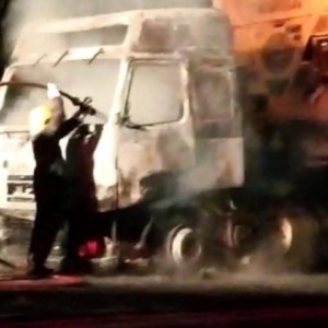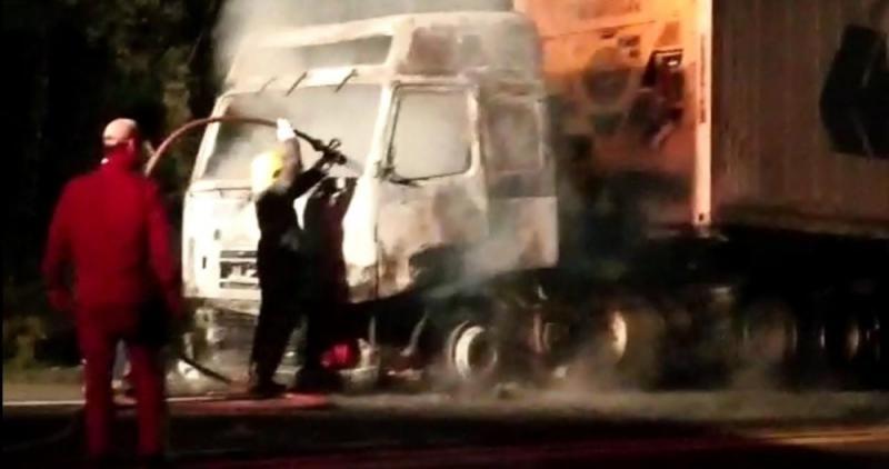 Uma carreta de Marechal Cândido Rondon ficou destruída em um incêndio na BR-277, em Nova Laranjeiras.