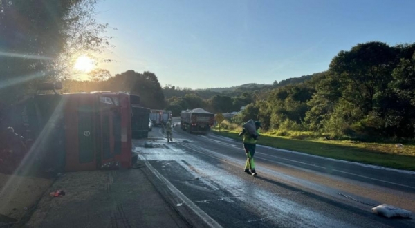 O veículo estava carregado com 50 toneladas de soja em grãos, nas imagens é possível ver que grande parte da carga ficou espalhada pela rodovia e foi
