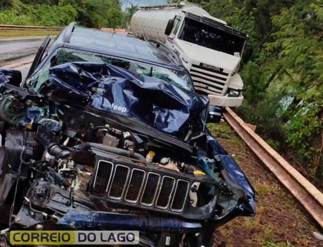 De acordo com as primeiras informações, a carreta teria invadido a pista contrária, colidindo de frente com um Jeep Renegade azul.