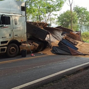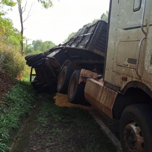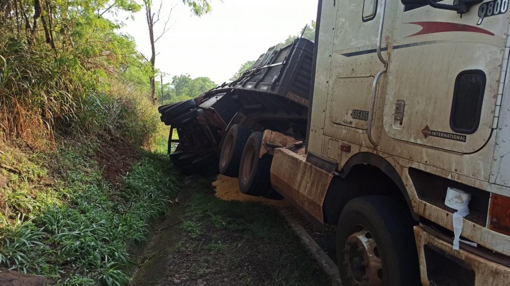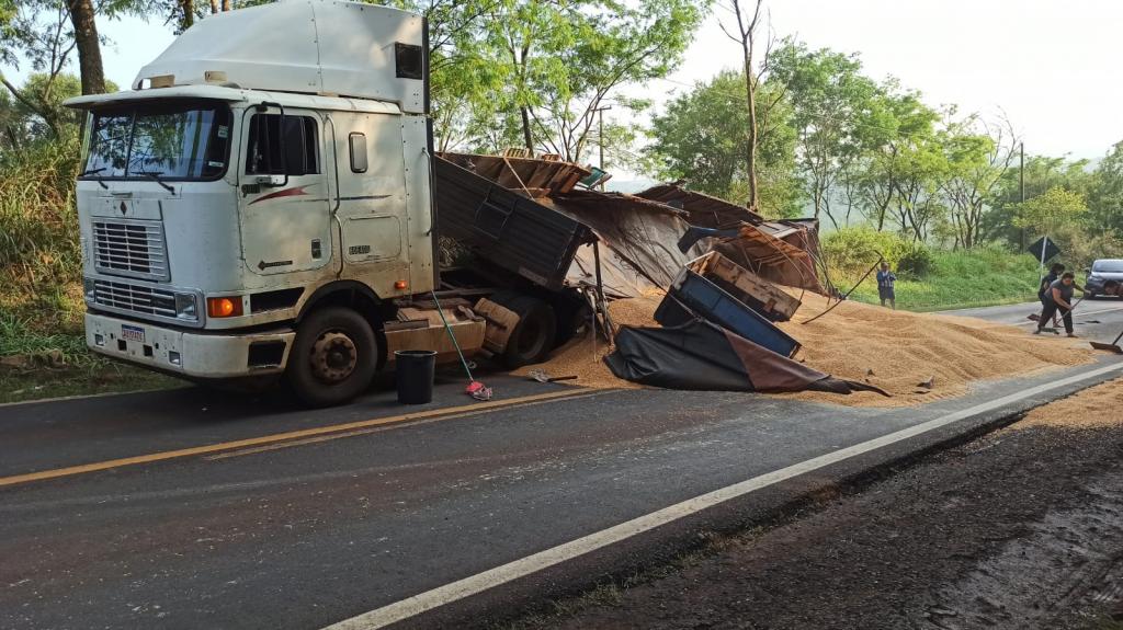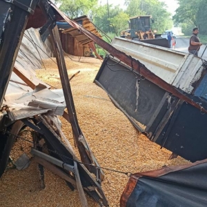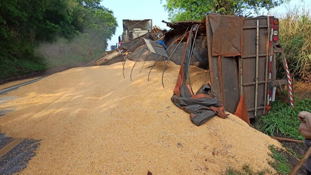 31 toneladas de milho ficaram espalhadas na pista da rodovia estadual PR 585 entre os municípios de Toledo e São Pedro do Iguaçu na manhã de hoje (25), próximo à ponte sobre o Rio Santa Quitéria em São Pedro do Iguaçu.