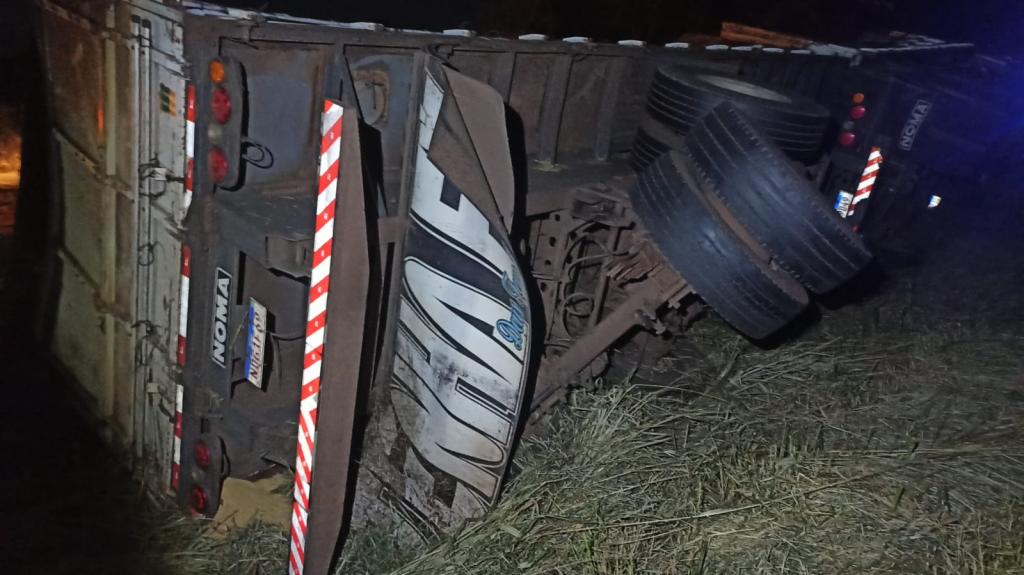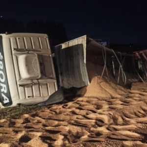 Uma carreta volvo bitrem carregada com farelo de soja tombou. De acordo com informações, o acidente aconteceu quando a carreta trafegava no sentido a Cascavel e logo após ter passado a ponte sobre o rio, o motorista perdeu o controle e saiu da pista e tombou dentro do canteiro central, espalhando a carga de farelo de soja na pista contrária.